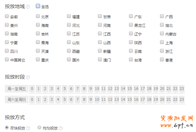 投放地域:地域的選擇非常關(guān)鍵,既影響著CTR又影響著ROI,而且與預(yù)算相關(guān),請(qǐng)注意這是重點(diǎn)喲。如下圖這是鉆展的時(shí)間地域圖,目前只細(xì)分到了省市,在投放的時(shí)候當(dāng)然不可全選: