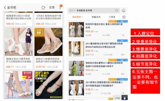 首先,我們可以先從無線主圖入手,進行差異化設(shè)計。無線主圖要做好注意6點,即人群定位、背景差異化、情景差異化、拍攝差異化、細節(jié)差異化、五張主圖一定要不同。