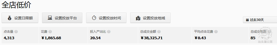 全店1:日限額50元,全店800多款寶貝,根據寶貝屬性,覆蓋曝光關鍵詞,統一出價,最高50%折扣,低價引入最大流量,計劃最終實現低至0.43的ppc,高達20的roi。
