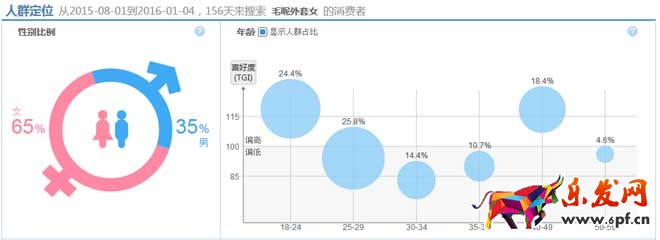性別男女對比3.5:6.5,年齡階段18-24 占比24.4% 25-29 占比25.8% 40-49占比18.4%。再這里大家可能會發現問題了,男女占比是3.5:6.5,也就是說10個搜毛呢外套女的人中就有4個左右是男的,男生搜這個是為什么呢?我們可能想到的原因就是:一、真實買家買來送人的或者妹子用男號購買,二、刷手