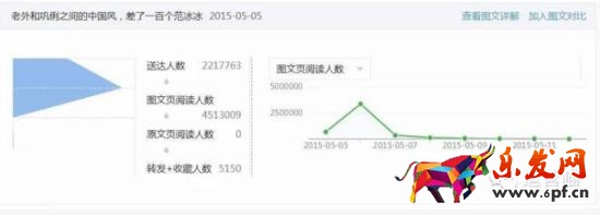 數(shù)據(jù)分析:這篇文章達(dá)到400萬(wàn)+的閱讀量,是當(dāng)時(shí)粉絲數(shù)(200多萬(wàn))的2倍,可見(jiàn)迅速引爆朋友圈帶來(lái)大量的分享。