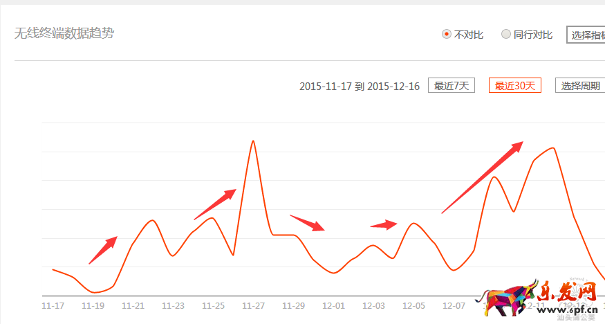 分析:從店鋪接手前的微淘粉絲基礎來看,達到了1w左右,粉絲基礎較好,但從流量角度來看,10.19-11.19期間最高uv也只是達到了100左右,是非常低的,從微淘轉化角度來看,成交雖然幾乎每天都有,但非常偶然,時斷時續。總體來說微淘方面還是具有一定潛力可以挖掘,同時可以作為店鋪流量引進的另一渠道。
