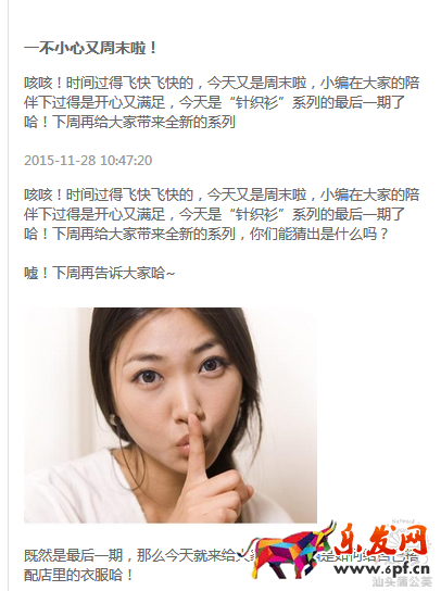 結合第一步中對店鋪人群的分析以及本身店鋪類目二級類目產品較多的情況,微淘推送以每周一個類目作為噱頭進行推送,主要結合三方面:店鋪上新、潮流搭配知識,選購產品建議。