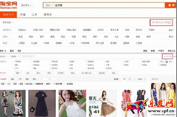 首先我們以“連衣裙”為例,在淘寶搜索框中輸入連衣裙,可以看到有2千萬個寶貝,競爭量非常大;如果在淘寶類目搜索連衣裙的話,總共寶貝有47萬,所以說競爭度不大,這大大增加了一個寶貝的曝光。