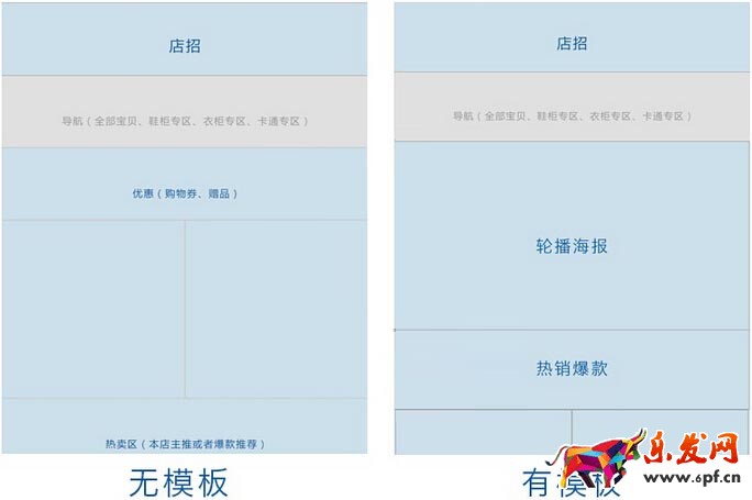 我們需要根據(jù)店鋪后臺(tái)的具體條件進(jìn)行首頁(yè)布局規(guī)劃。如圖:(有模板布局 無(wú)模板布局)
