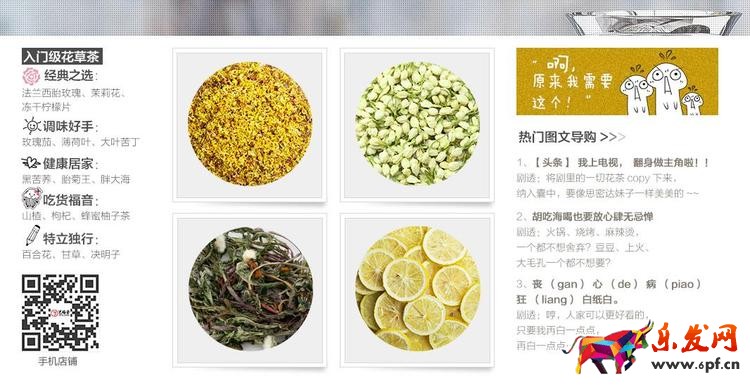而受眾群體相對年輕的花草茶,品牌專門為其打造了一個名為花草頻道的頁面,年輕人更加個性化,在花草茶頻道的頂端品牌打出了“定制你專屬的那杯茶”的口號。產品展示圖走小清新文藝范兒。在文案中更突出個性化,比如調味好手、健康居家、特立獨行等,更多地為年輕消費者傳達一種生活理念。有意思的是,藝福堂還在花草茶頻道設置了圖文導購,利用年輕人普遍關心的話題:電視劇、美白瘦身,吸引消費者點擊進入。這樣做的好處在于,品牌可以有針對性的進行營銷推廣,消費者可以得到更精準有效的產品信息,從而促進銷售轉化。