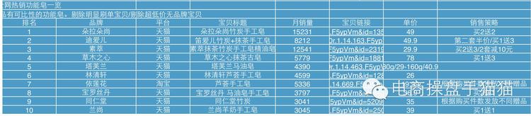 到這里聰明的已經看明白了,這些口味的自然搜索流量,無法滿足這些手工皂的基本銷量。這個時候,你會發現你可以推的只有手工皂一個詞。 這意味的,手工皂可以是任何皂,不一定是玫瑰或者是茶樹。那么我們再看以下表格,是全網銷量前十的賣家。你會發現他的銷量是非常大的。而口味就那么幾個。
