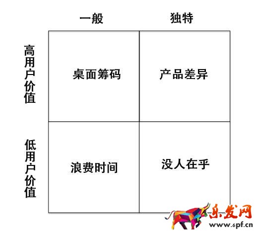 如果某一產品特性具有很高的客戶價值,但從整個市場來看并不夠獨特,那這就被稱為“桌面籌碼”。雖然顧客十分重視且需求量大,但是因為缺乏獨特性,它并不能讓你的產品脫穎而出。