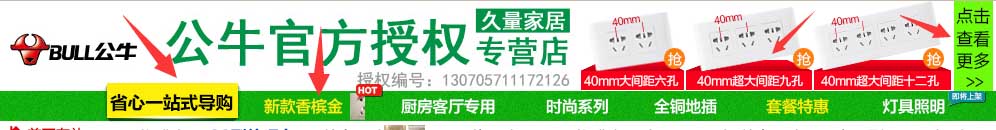 店頭,公牛的代理商基本都用統一規格的店招設計,在設計使用的時候賣家提供的店招尺寸有點過小,990px的寬度是常規的設計尺寸,但目前市面上的顯示器基本都是使用寬屏,大部分的賣家店招會做成1125-1185px,能夠與下方的展示界面對齊,相對的展示空間可以寬松一點。另外就是店頭的文字排版,現在的顯示過于緊湊與凌亂,如果把所有的內容切成小塊,就可以看出排版間的問題;