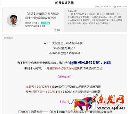 1、雙十一大促將至,各種活動源源不斷,淘寶為了幫助平臺賣家規(guī)避風險,特設(shè)【問答專場活動】,邀請阿里巴巴集團法務專家在【問商友】板塊就營銷活動等大促問題進行免費法務咨詢,有問題的商家們可前往提問。