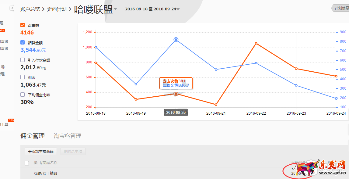截圖是從8月26到9月24日的某家女裝店鋪的淘寶客數據,大家可以看到,做了淘寶客之后,點擊數和引入付款金額都翻了一倍。