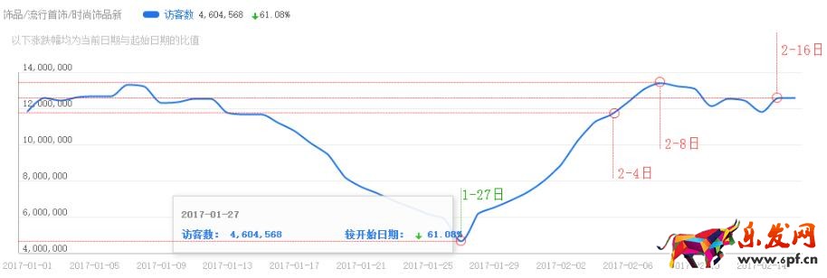 根據線形圖我們可以看到,在之前受過年影響1-27日行情情況將至冰點僅有4,604,568 訪客量,飾品行業的整體數據自2-1日開始迅速回升, 2-3日恢復到節前的流量級別千萬級流量,2-8日達到最巔峰反超年前流量,至此市場已完全恢復正常狀態。
