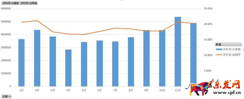 如果我們想把兩個不同量級的維度進行對比,例如【訪客戶】和【加購率】,如下圖所示。