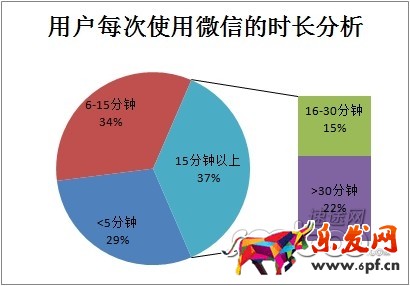 用戶每次使用微信的時長看,小于15分鐘的占大多數(shù),其中29%的用戶使用微信時長小于5分鐘,34%的用戶使用時長在6-15分鐘。只有37%用戶使用時長在15分鐘以上。因而微信還需要提高用戶的粘性,進一步增加微信的吸引力。lwvS}:e.W6E~