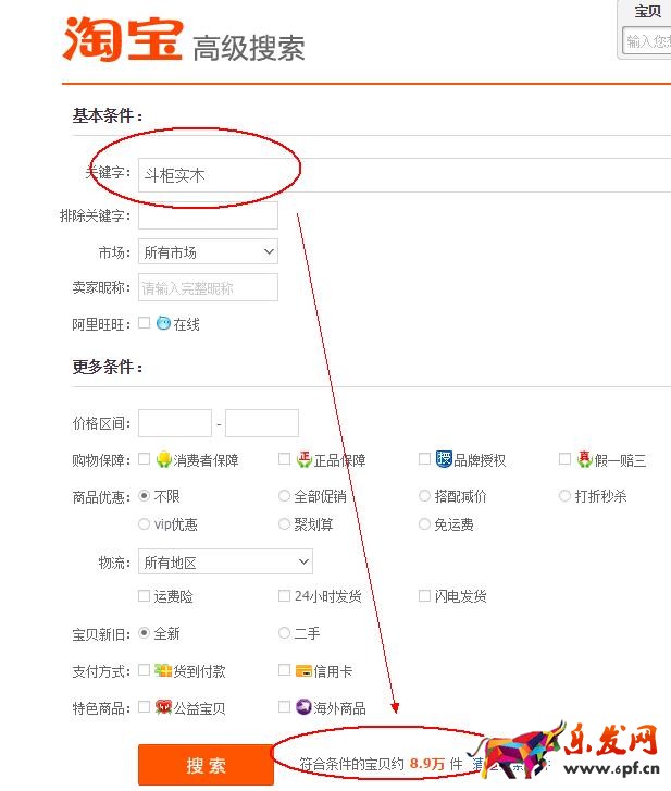 第二步在淘寶首頁打開商品分類,里面有高級搜索,打開高級搜索,輸入斗柜實木。我們可以看到有8.9萬的寶貝,也就是8.9萬的競爭。
