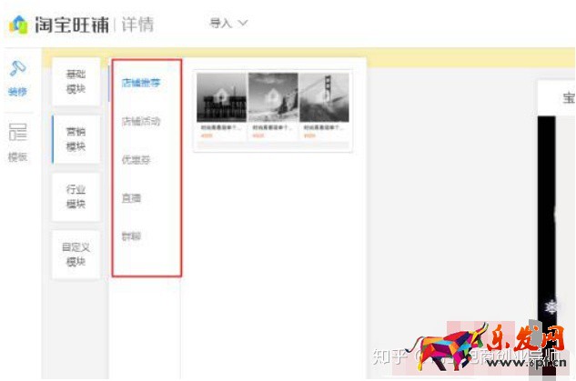 入口:進入賣家中心,找到“店鋪裝修”,進入淘寶旺鋪后,選擇“詳情頁裝修-單品-裝修詳情”。進到無線端詳情頁布局頁面,在左邊找到營銷模塊,將這些模塊添加到無線端詳情頁中:
