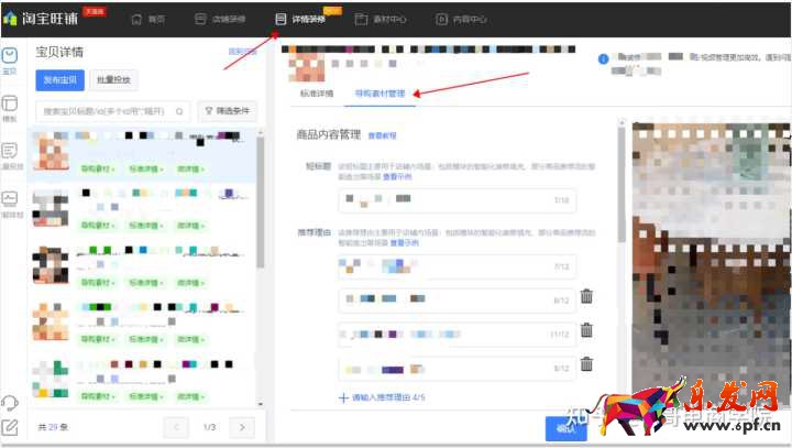 千牛工作臺——店鋪管理——店鋪裝修——詳情裝修——選中寶貝——導購素材管理