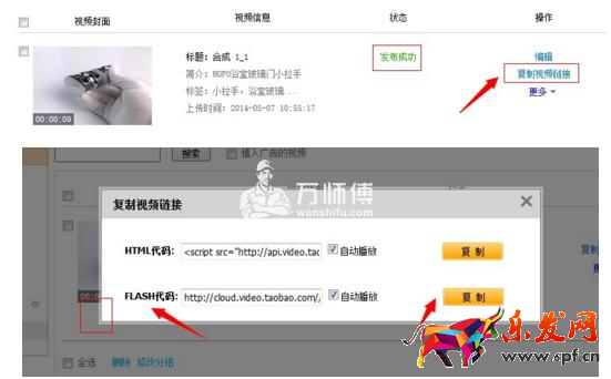 視頻發布成功后,點擊【復制視頻鏈接】復制視頻的flash代碼,然后把視頻flash代碼插手到免費添加視頻的代碼傍邊,如圖: