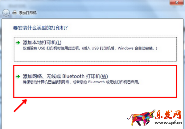 2.選擇“添加打印機”之后會提示給你兩種類型的打印機,一種是本地的USB打印機,另一種就是添加網絡或者無線打印機,我們選擇添加網絡或者無線打印機(如下圖):