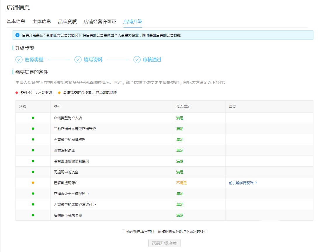 拼多多個人店鋪升級企業店鋪需要先解綁提現賬戶。