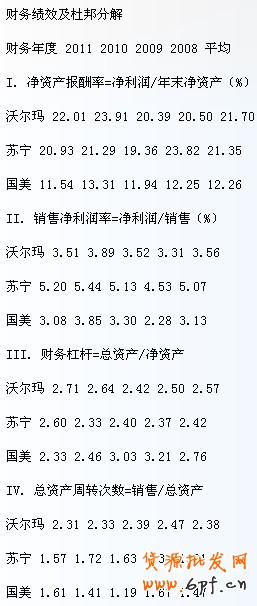 圖表1的I部分報(bào)告了 沃爾瑪 、蘇寧和國美最近四個(gè)財(cái)政年度的凈資產(chǎn)報(bào)酬率及其杜邦分解。從圖表1來看,2008~2012年這四個(gè)財(cái)務(wù)年度, 沃爾瑪 的凈資產(chǎn)報(bào)酬率分別為20.50%、20.39%、23.91%和22.01%,四年平均為21.70%。除2009年蘇寧的凈資產(chǎn)報(bào)酬率高于 沃爾瑪 之外,其余年度蘇寧的凈資產(chǎn)報(bào)酬率均遜于 沃爾瑪 ,這四年財(cái)政年度蘇寧平均的凈資產(chǎn)報(bào)酬率為21.35%,略低于 沃爾瑪 。而國美由于近些年來董事會在吵架 ,董事長也不務(wù)正業(yè) ,最近四年平均的凈資產(chǎn)報(bào)酬率僅為12.26%,差不多只有蘇寧和 沃爾瑪 的一半。